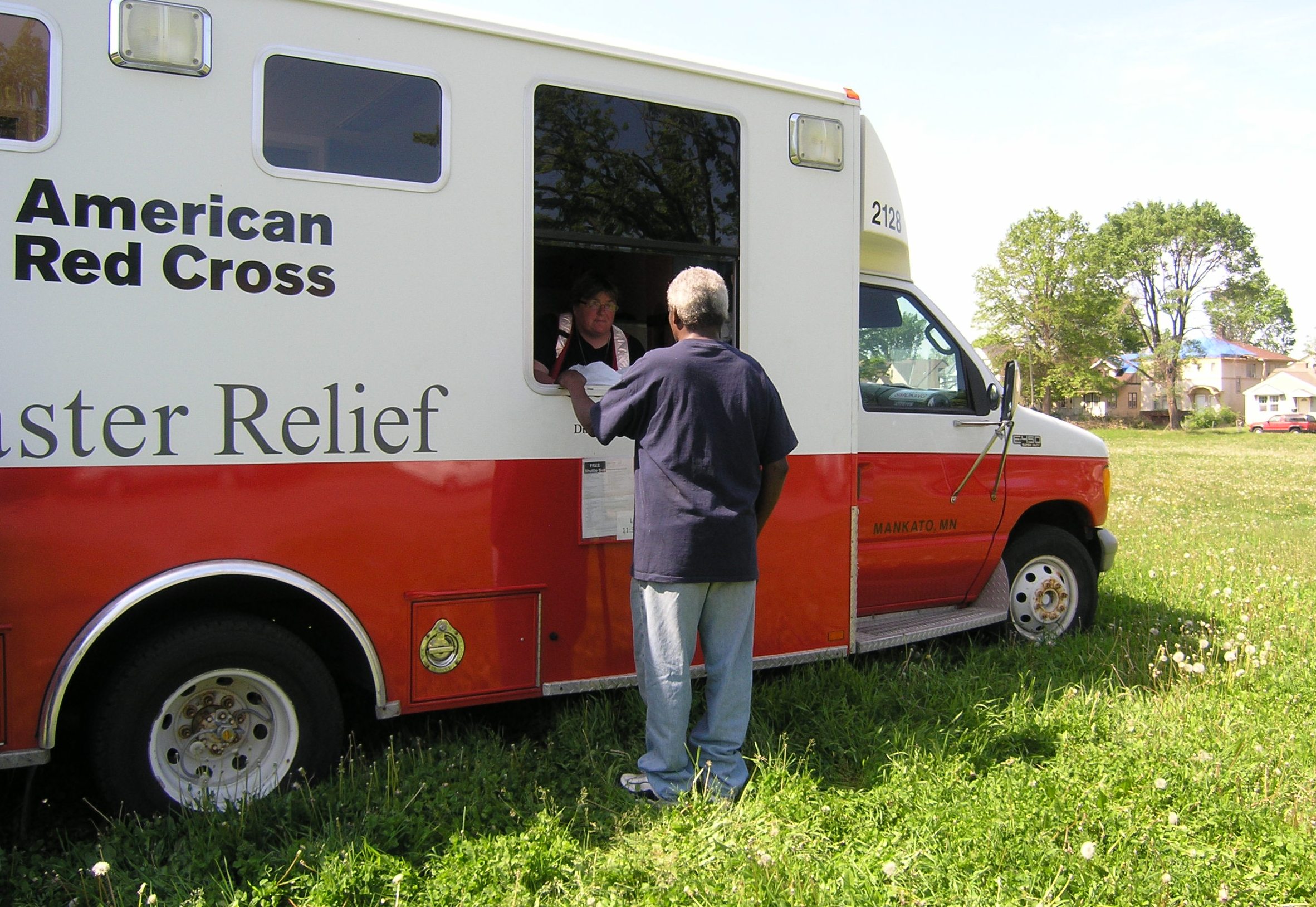 Branker picked up lunch for him and his wife at the Red Cross aid station, which is one of two that the Red Cross is operating in conjunction with the City of Minneapolis disaster recovery shuttle buses in the neighborhood. The second station is at Jordan Park.