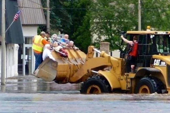 With flash flood waters rising fast, apartment building manager Roy Heller–rounded up his building’s residents and moved them to the building’s second floor. The next morning a front-loader made 3 trips to the building, carrying the bewildered residents to safety. Two had oxygen machines. At least one had prescription drug requirements and was concerned about getting refills. One of the ladies said: “my butt got rusty riding in that bucket.”