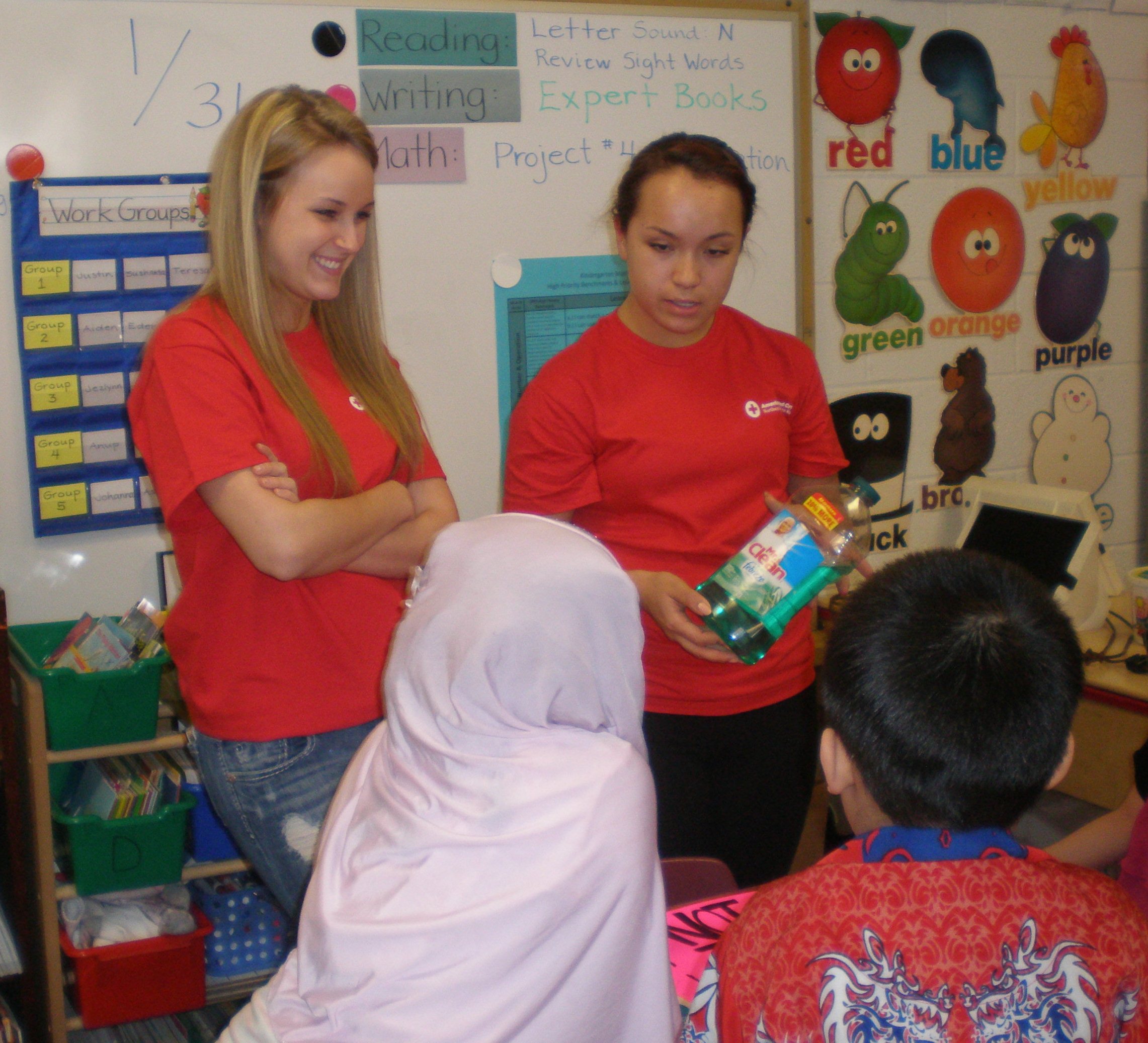 Katie and Nicole from the Como Park Future Educators Club talk with kids about safe substances versus poisons in the home. (Photo credit: Lisa Joyslin/American Red Cross)
