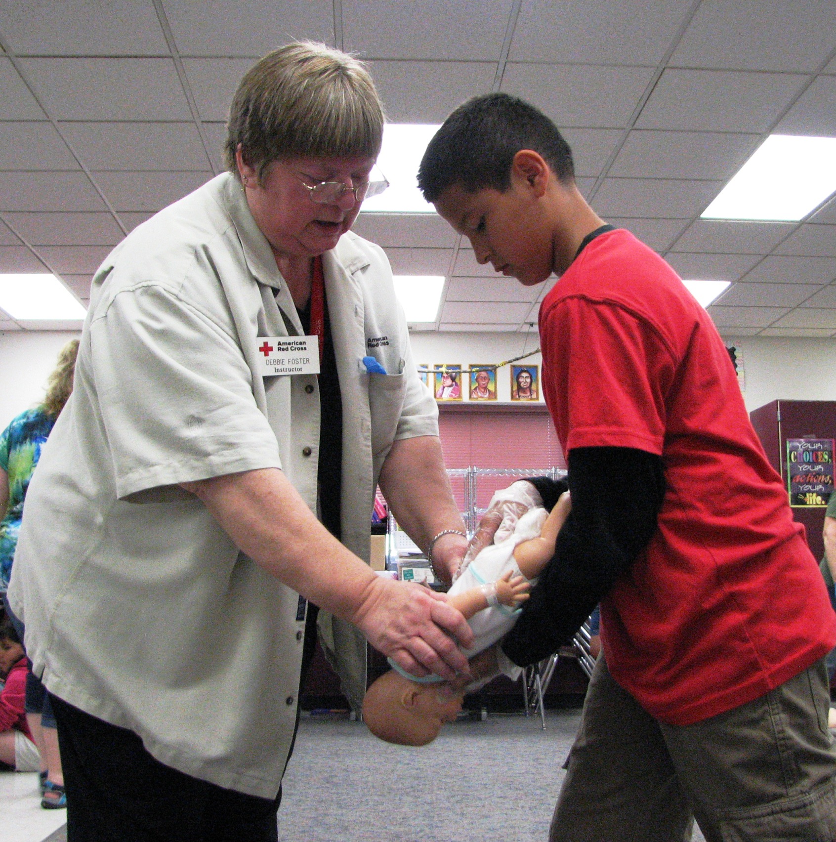 Wearing gloves while cradling baby dolls, the children stood in two-person teams practicing skills and repeating Red Cross instructor Debbie Foster’s directions for how to respond to a choking emergency.