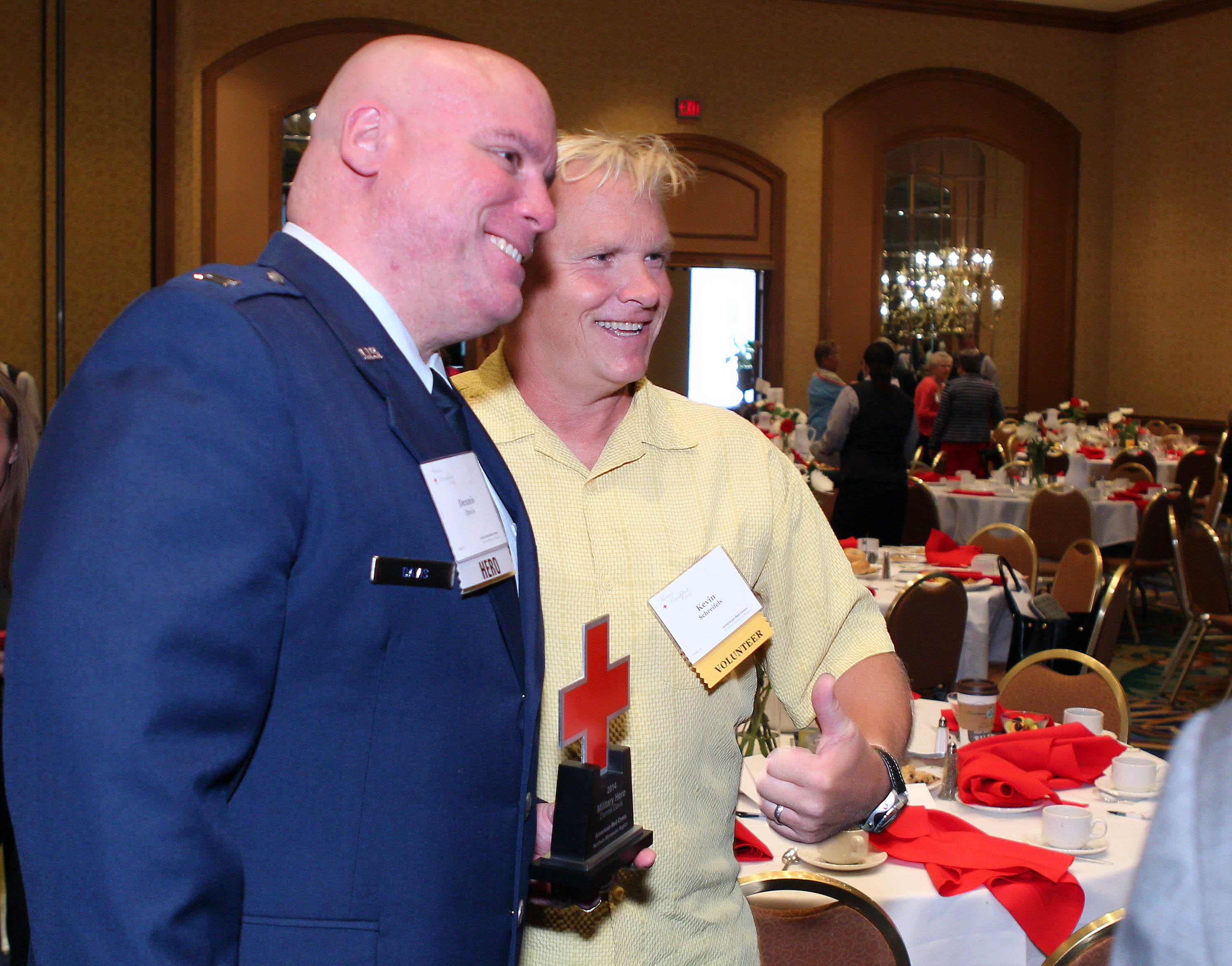 Give Life Hero Kate Ross (l) with Red Cross board member Tom Meyer. Photo credit: Andy KingNational American Red Cross President and CEO Gail McGovern. Photo credit: Andy KingMilitary Hero Dennis Davis (l) and Red Cross Social Advocate Kevin Schreifels. Photo credit: Andy KingLocal Red Cross CEOs Geoff Kaufmann and Phil Hansen. Photo credit: Andy KingUSBank CEO Richard Davis. Photo credit: Andy KingAround 450 people attended our 2014 Heroes Breakfast in Minneapolis. Photo credit: Andy KingThe 2014 Heroes (l-r): Zoran Pedisic, Shane Linehan, Kate Ross, Sydney Book, Dennis Davis and Pat Harris. Photo credit: Andy KingLocal Red Cross board vice-chair Lori McDougal. Photo credit: Andy KingRed Cross President & CEO Gail McGovern takes a group “selfie” with the Social Advocates. Photo credit: Carrie Carlson-Guest