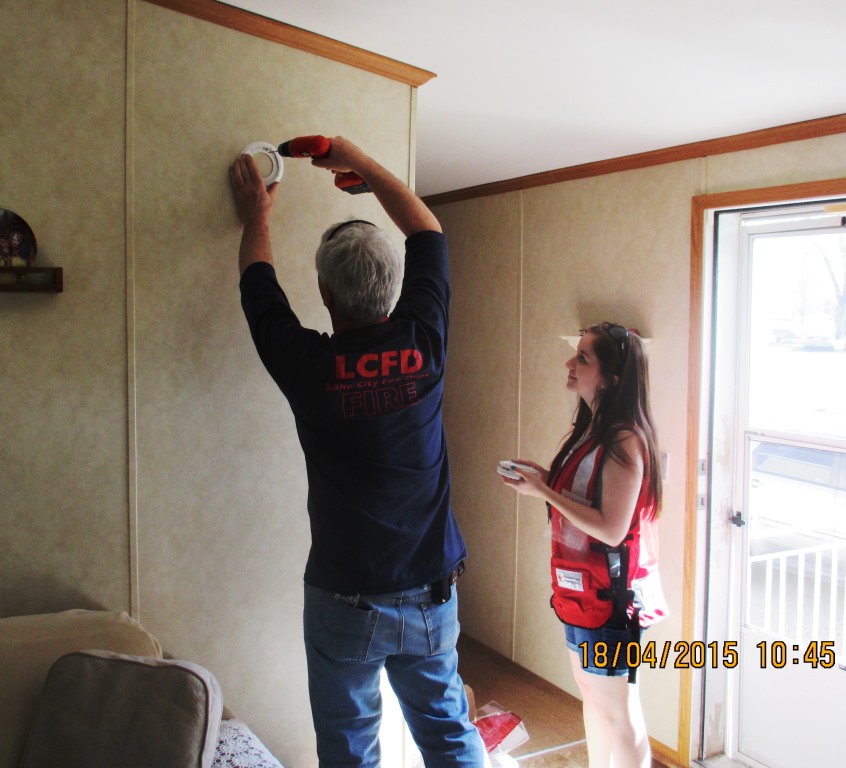 Volunteers were made up of Red Cross volunteers, firefighters, Kiwanis members, and local community members. We had three Spanish language speakers who used their talent helping interpret for a few families. Everyone met at 8:30 a.m. for coffee, rolls, and training. Lake City’s fire chief Jeff Diepenbrock, and his wife Julie, came out Saturday to help install alarms. Jeff started off the day thanking the volunteers for their dedication and time. He also talked about fire safety and the importance of smoke alarms. Everyone set out about 9 a.m. and finished around noon. When everyone returned, it was great to hear some of the appreciation stories that families told where alarms were installed.
