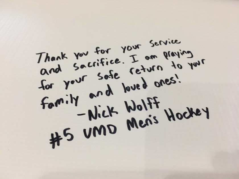 “It’s a really good way to reach out and show our appreciation to people that we may never get the chance to tell in person. It took less than an hour of our time,” says Jalyn Elmes, captain of the University of Minnesota Duluth, Women’s Hockey team. Elmes has participated in Holidays for Heroes in the 2018 and 2019 holiday seasons.