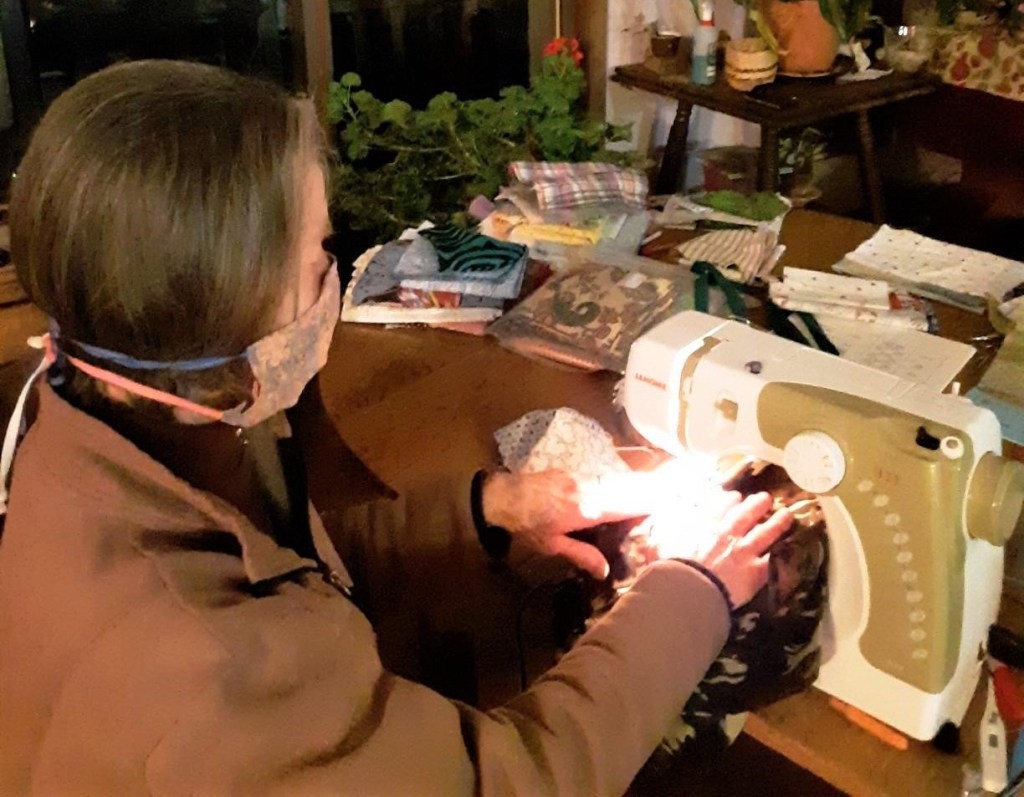 JoAnn, pictured above at her sewing machine, made face coverings for the VA in Hot Springs, South Dakota. For her, taking up the sewing project was a way to come together during a time when lives have changed so much and so quickly. “I learned about the need for face masks and just one mask turned into forty! The challenge encouraged me to keep reaching out. Thank you for the privilege and honor to assist the Red Cross and the VA.”