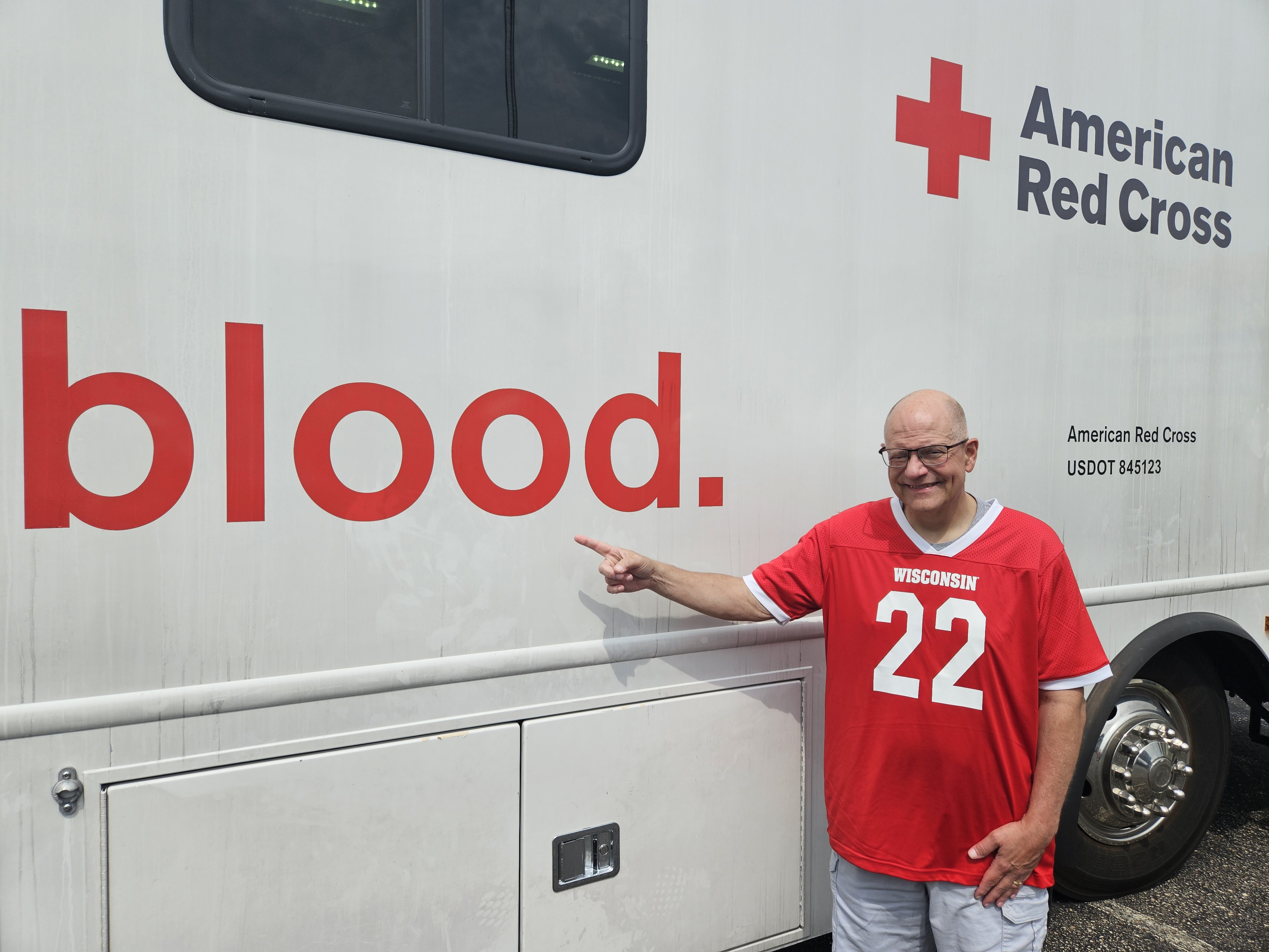 Jack Colwell, who announces games as Action Jack, pictured outside the Red Cross bloodmobile at a blood drive his employer KWNG/KCUE in Red Wing, Minnesota recently hosted.