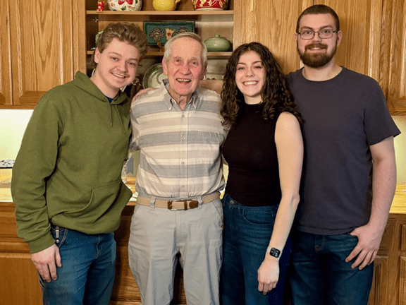 For his 81st birthday, Minnesota and Dakotas Region biomed volunteer and blood and platelet donor Gordy Kircher was deeply touched when his grandchildren — Will, Johanna, and Ethan — donated blood for the first time in his honor, carrying forward his lifesaving legacy.