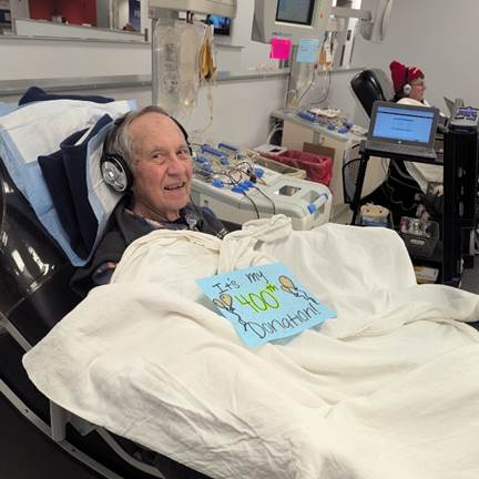 Gordy celebrates his 400th donation, marking decades of dedication to helping others. Photo submitted.