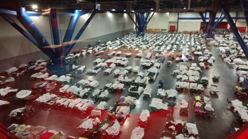 My assignment was to work 12-hour shifts at Smith Recreation Center. This Red Cross shelter was planned to be the last to close in Fayetteville. This meant that as other shelters closed people who had not been able to find housing were relocated to Smith. The shelter had about 150 people in residence, many who were among the most vulnerable people in the city: people with mobility issues, unstable chronic conditions exacerbated by displacement, chronic untreated mental illness, addiction, in hospice care, and (previous to the disaster) long-term homelessness.