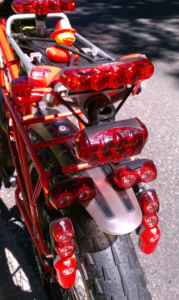 The other day while riding along the Minneapolis Grand Rounds bike path, we stumbled across Blaine Mogren. He loves bikes. He looooooooves bikes. Among the bikes in his collection is this fine (pictured left) Surly Pugsley. He has six of them. This particular one he calls Fire Engine Pugsley. We can see why. For starters, its BRIGHT RED. It also has loud horns, flashing lights, and a fire-fighter rubber duck. And crosses, white ones (like on the Swiss flag). After a minute of chit-chat with Blaine this thought emerges: let’s make a Red Cross Pugsley!
