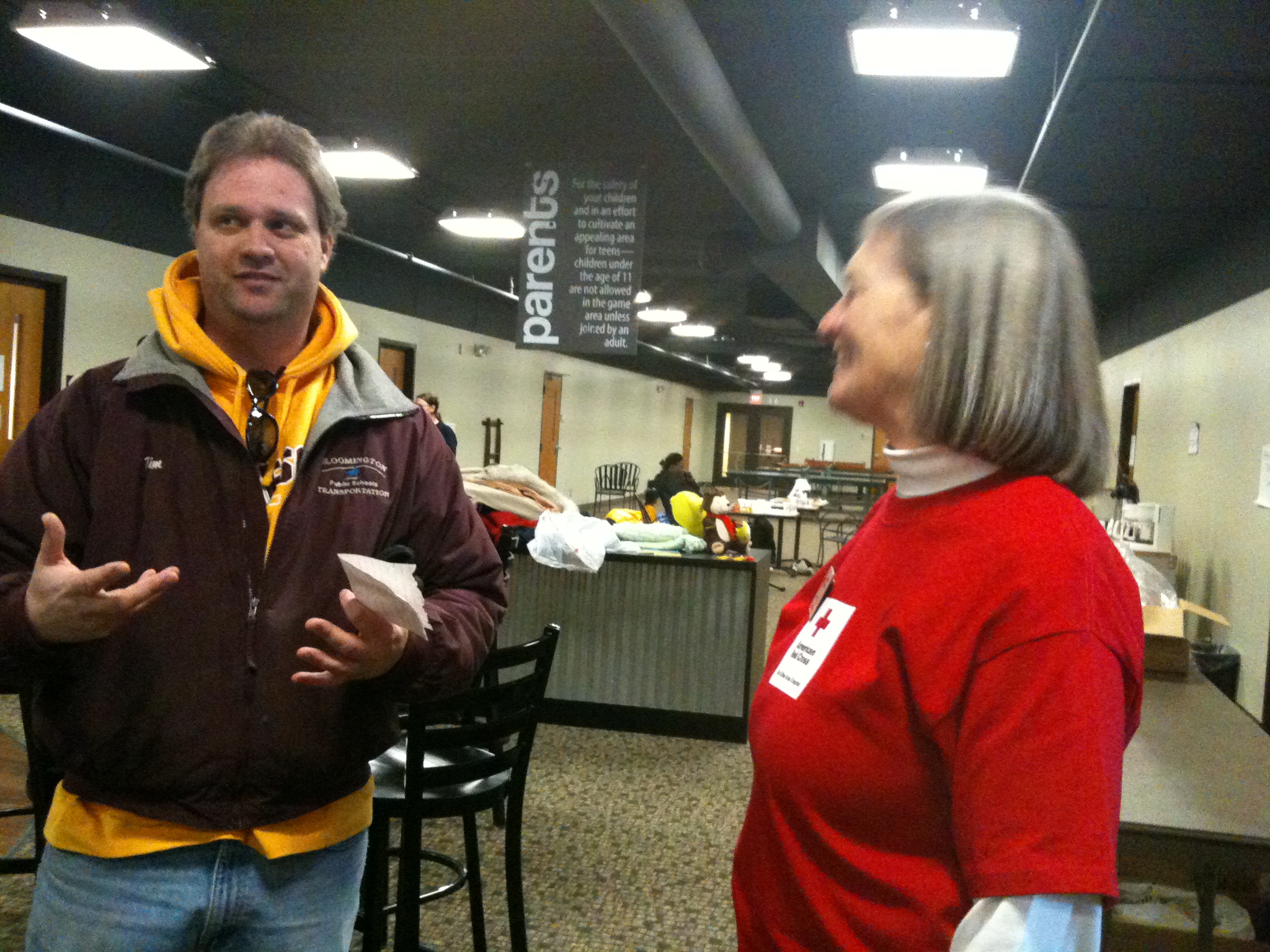 Red Cross volunteer Sharon Collin is a natural organizer. A former movie theater manager, accountant and school teacher, she’s at ease while directing the flow of traffic that comes through the North Commons Recreation Center where the Red Cross shelter is housed.